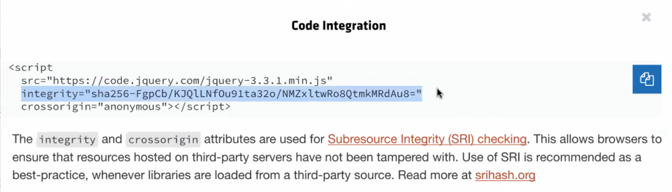 Good, modern content delivery networks (CDNs), such as jQuery, provide integrity-check configurations when they tell you how to use a resource. Here’s a snippet of code they generate for you when you want to use a particular version of their library: