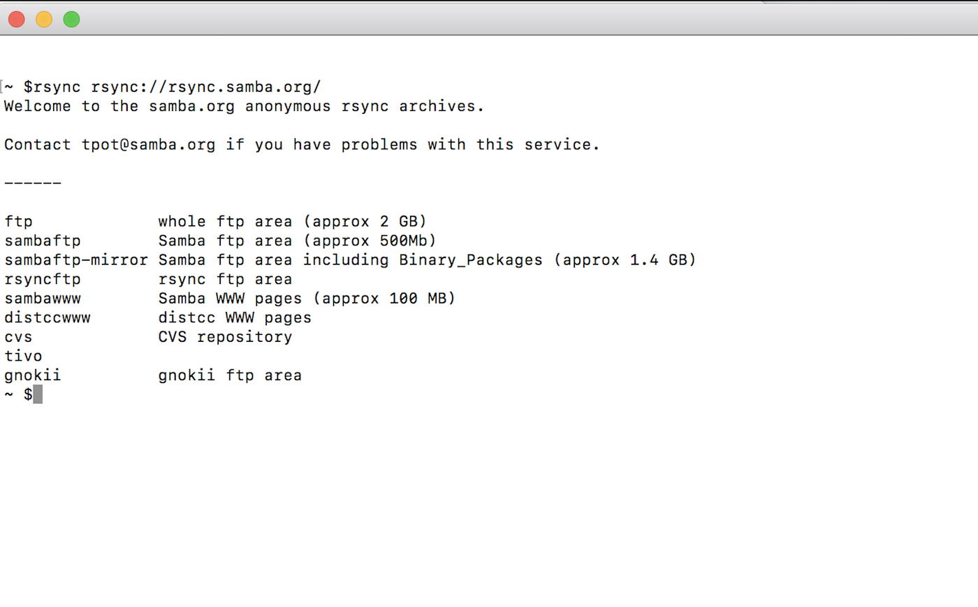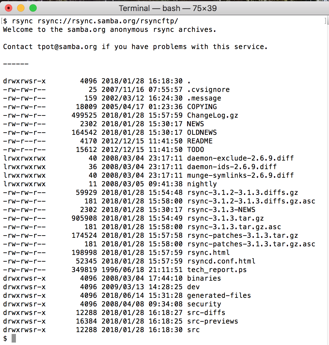 In daemon mode, rsync organizes files using modules, which are just symbolic names and descriptions that point to a specific directory reachable by the user running the rsync daemon. As an example of what a client sees from the module level, when we look at the rsync instance used to distribute rsync itself—rsync.samba.org—we see eight modules presented after a brief greeting or “message of the day,” as seen below: