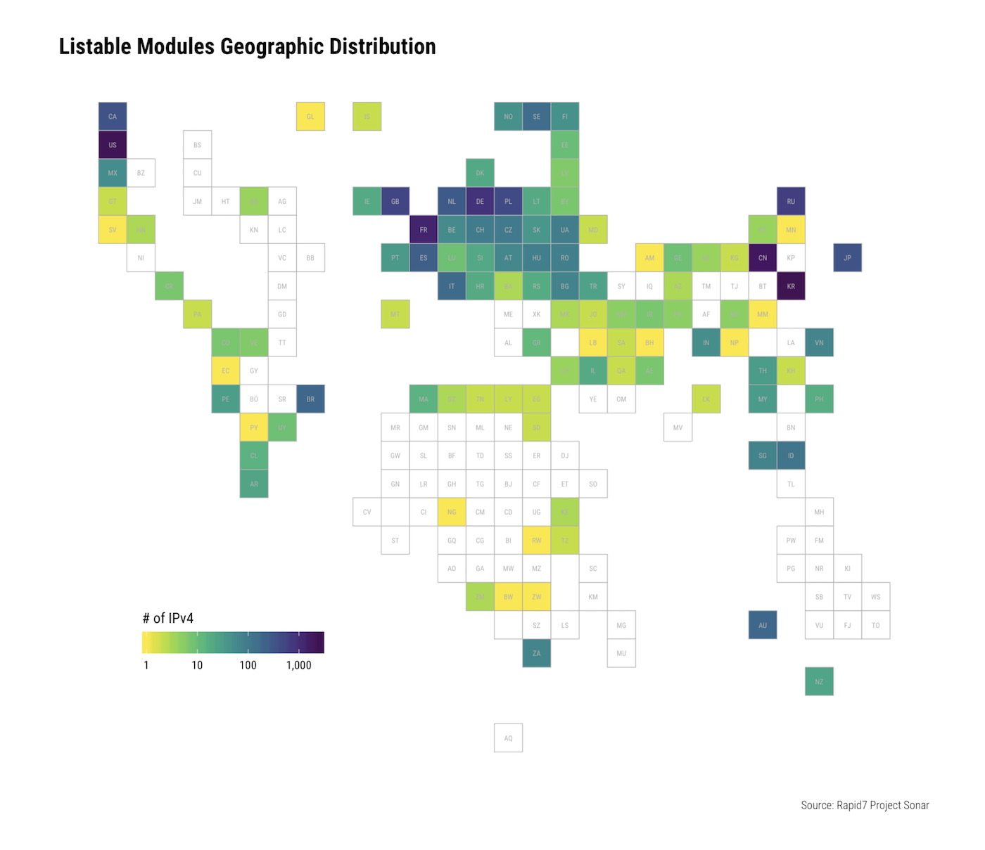 As part of all endpoint studies, Project Sonar stores information about the IP in question at the time of study, including geographic metadata and the organization that owns the IP. Both of these are largely ASN-based, adding some level of bias to any analysis based on this data.