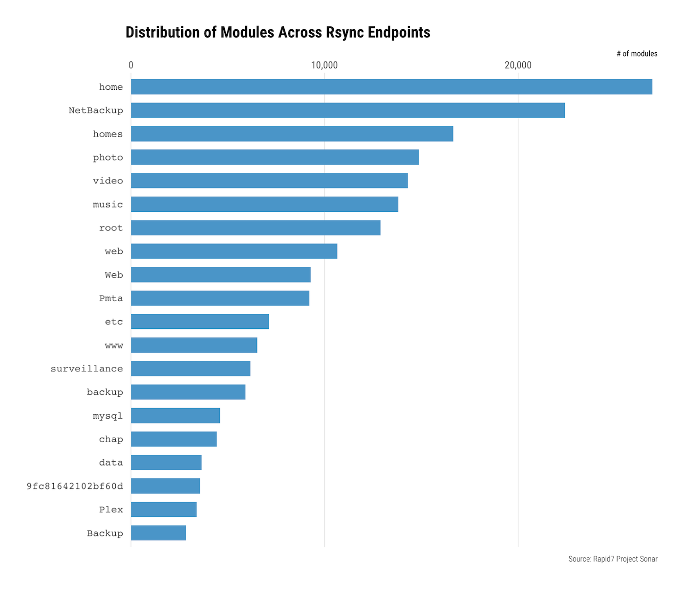 Overall, the names of these modules suggest that most of these publicly available rsync instances are being used for backup and archival purposes, which is not surprising given rsync’s purpose and history. However, it is initially worrying to see modules such as root, home, surveillance, www, and data, all of which sound like they contain potentially sensitive information. For the systems exposing the root module, there are eerie similarities to some of the previously mentioned CVEs.