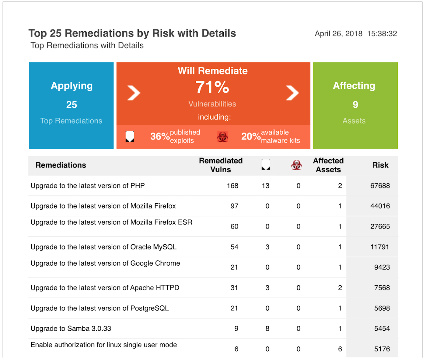 While the Top 25 report gives quick and easy fixes through a brief overview, you can dive even deeper with the Top Remediations with Details report. This template provides expanded information from the Top 25 report, including the percentage of total vulns resolved and the number of assets that will be affected when remediation solutions are applied. The details in this report can help you dig further into what to expect from these remediations throughout your organization.