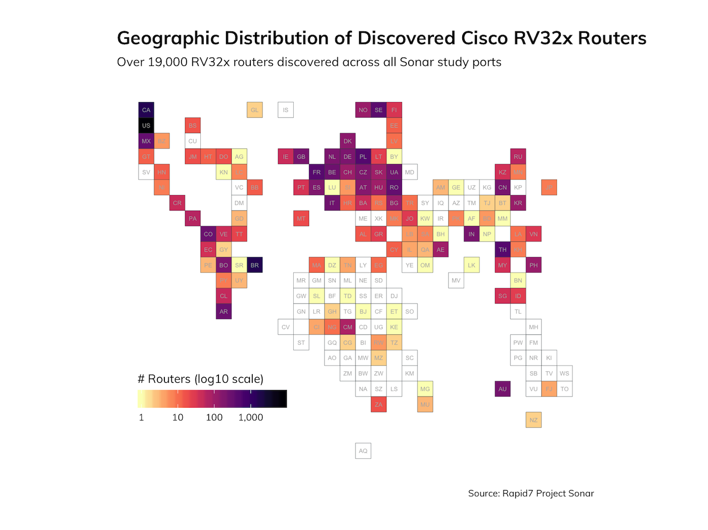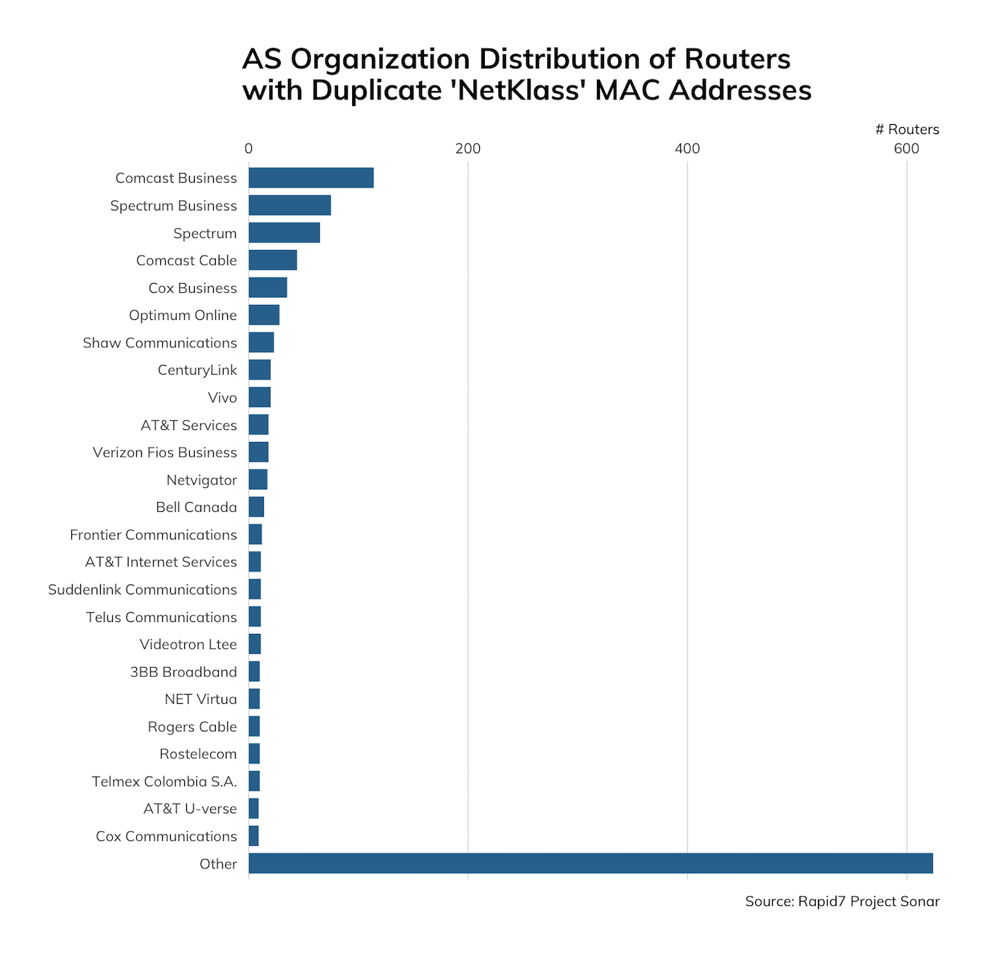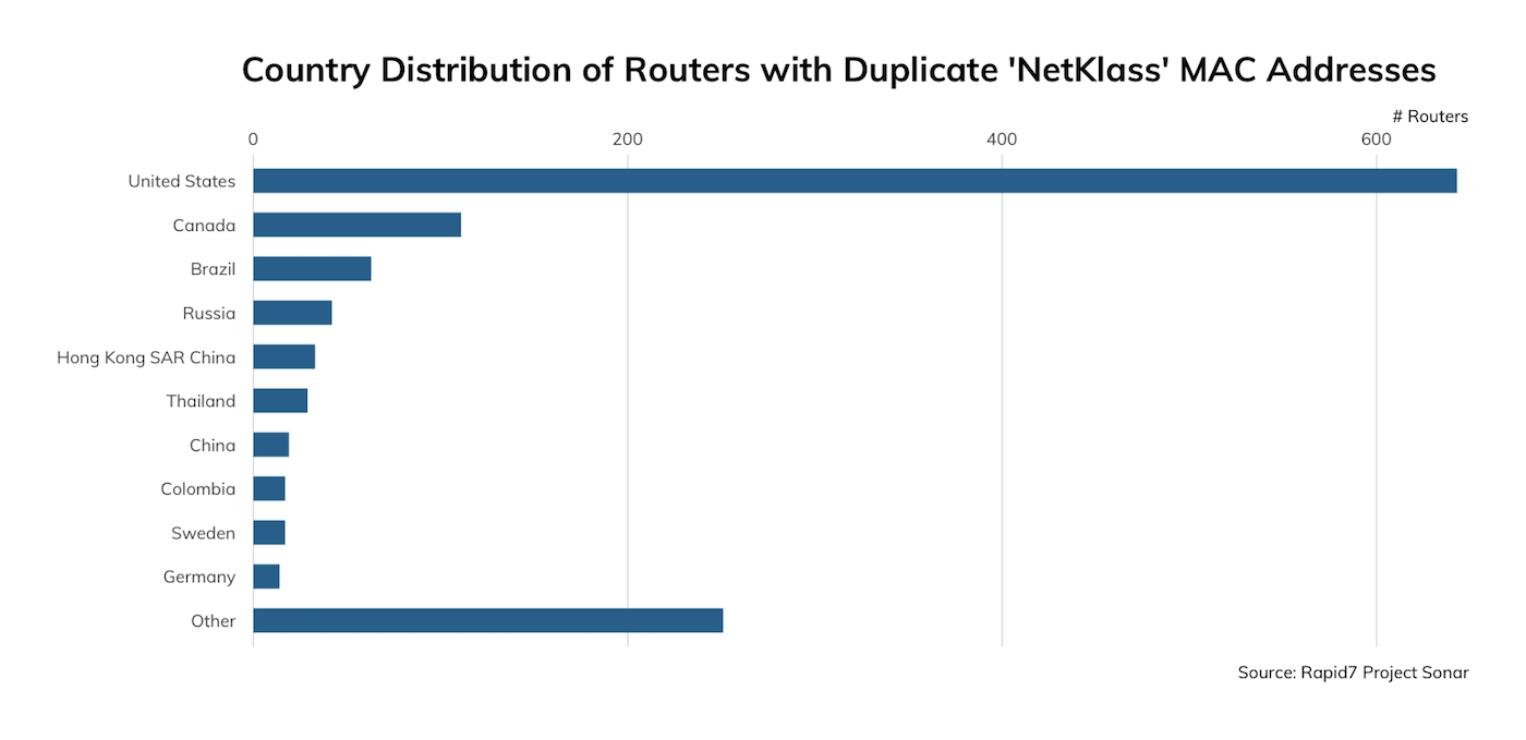 Rapid7 Senior Security Researcher Jon Hart noticed the presence of MAC addresses in the SSL certificates and decided to pull on that thread a bit. Most of the MAC addresses in the CN field were unique (~15,000), and most belonged to “Cisco Systems, Inc”. But, we noticed there were some duplicate MAC addresses. One MAC address in particular—00:0e:a0:13:03:88—that belongs to NetKlass Technology Inc. appears on over 1,200 devices that are not isolated to a particular geographic region or autonomous network: