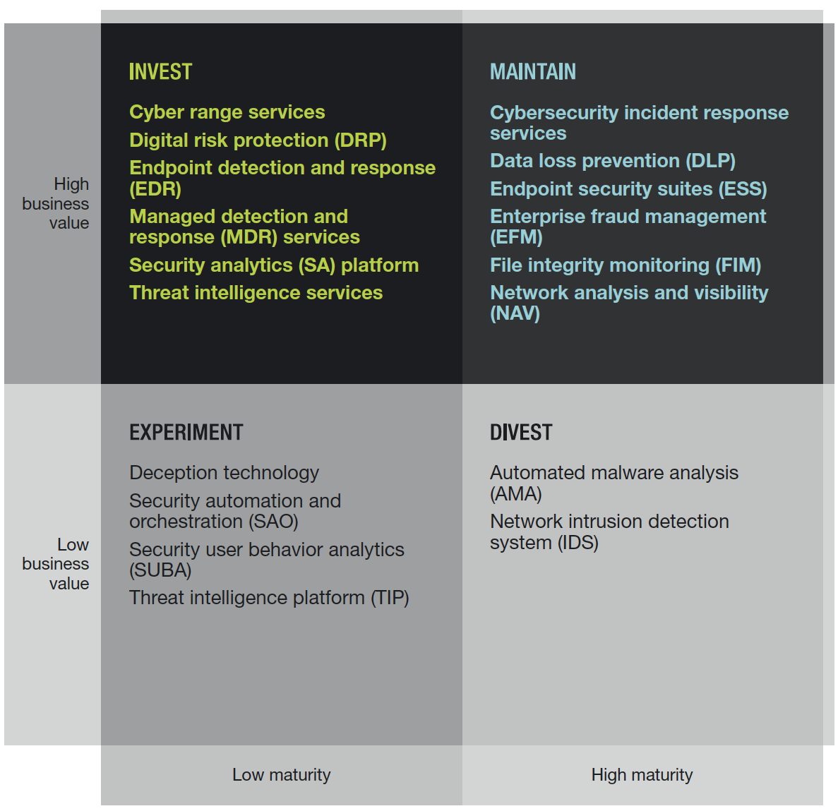 The report covers 18 (!) different technologies and highlights what each technology does, where it’s going, and which vendors represent it. As shown above, each technology is categorized by level of business value, as well as its maturity. For example, many readers are familiar with the mature space of intrusion detection and prevention systems (IDS/IPS). Forrester recommends a divest, noting, “With the decreasing emphasis on detection at the network gateway, the majority of security teams prefer to replace these legacy devices with next-generation firewalls (NGFWs).”