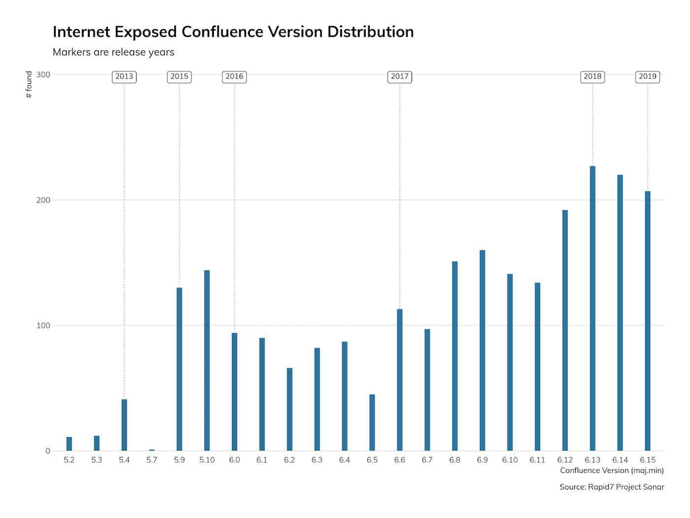 Rapid7 Labs’ Project Sonar discovered nearly 20,000 publicly exposed Confluence servers, as seen below, with over 2,500 being in the version ranges impacted by this vulnerability (however, sites running seriously older versions of Confluence have many other things to be worried about as well).