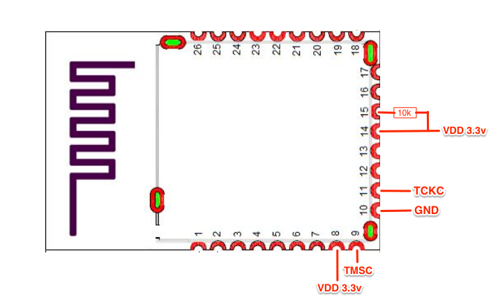 Because we are testing against a standalone BLE module, we will also need to supply the needed voltage (3.3v) and add a 10k ohm pull-up resistor to the RESET_N pin 15 and add that to pin 14. We also need to make sure we have a 3.3v power source and connect that to pin 14 and pin 8, as shown below: