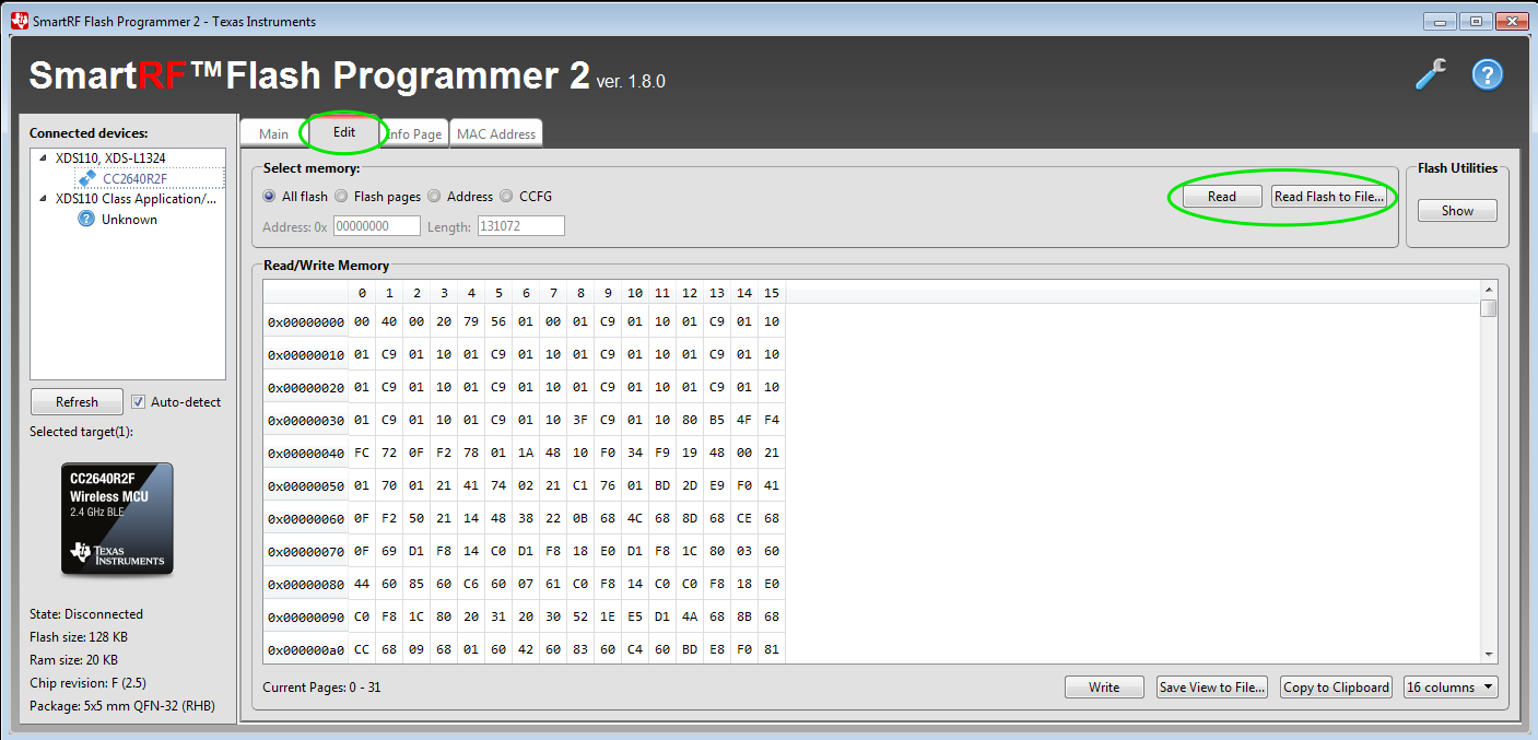 To extract the firmware from the device, we next select the Edit tab. From there, we can read the flash memory and save it to a file by selecting Read or Read Flash to File:
