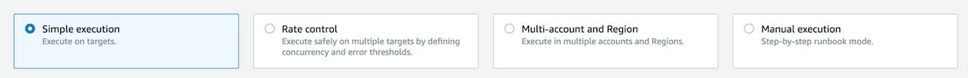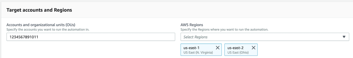 We can run this simply with an instance ID of a single EC2 instance, we can run this against a resource group or list of tags, or entirely different accounts. For this example, we’re going to choose Multi-account and Region. We can use Account IDs or Organizational Units, as well as selecting the applicable regions: