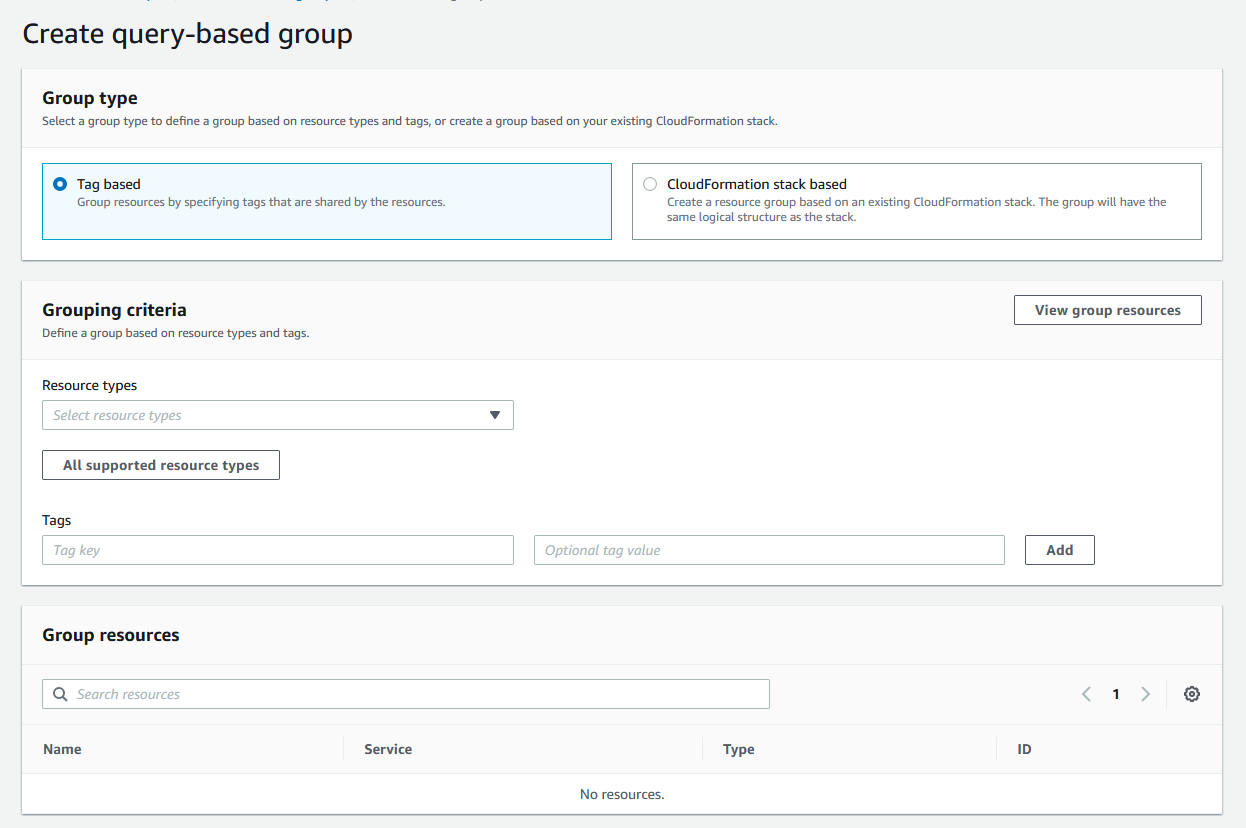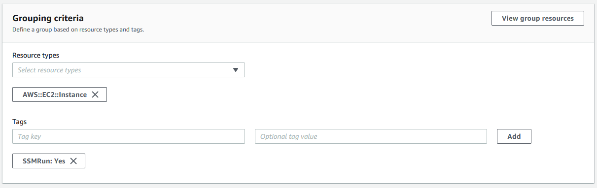 What’s really cool about resource groups is you can either use a tag-based approach, or you can actually use a CloudFormation stack if you’re already revving up your infrastructure with CloudFormation. For this example, we’ll use tags. I’m looking for the AWS::EC2::Instance resource type, and for the key:value pair SSMRun:Yes: