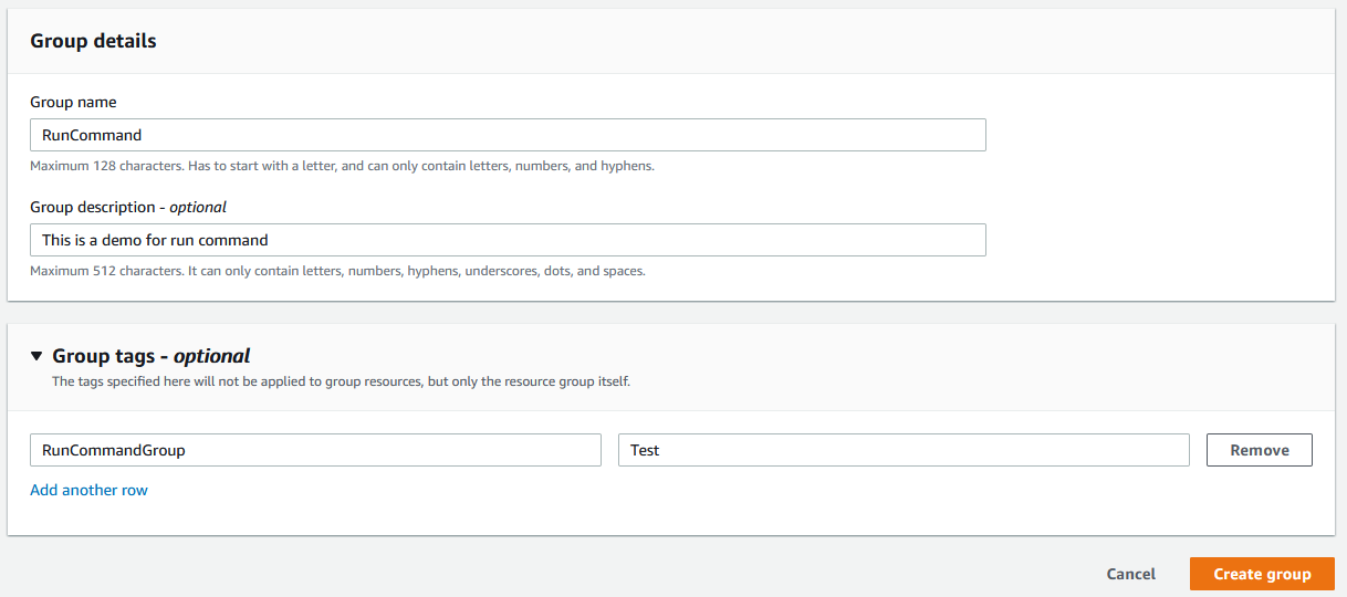 aws resource-groups create-group --name RunCommand --resource-query '{"Type":"TAG_FILTERS_1_0","Query":"{\"ResourceTypeFilters\":[\"AWS::EC2::Instance\"],\"TagFilters\":[{\"Key\":\"SSMRun\",\"Values\":[\"Yes\"]}]}"}'