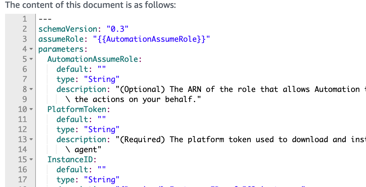 First, what is an automation document? An automation document is a JSON or YAML file containing actions that can be executed on different resource types in AWS. Steps in this document are run sequentially and can even invoke AWS APIs. In our document, we’ll leverage the SSM API to gather the operating system on every EC2 instance we’re running against. Then, we’ll run commands to install the Insight Agent. We’ll use aws:branch within our document to run either the Linux script or PowerShell script based on detected operating system.