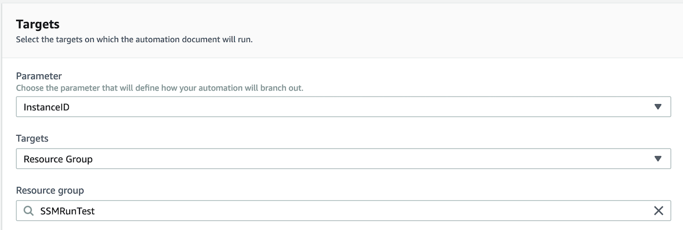 On the section, we’ll define what we look for to branch out on our run command. We’ll select the instance ID option. As for the Targets, we’ll select resource group (but feel free to use tags or even a comma-separated list of instance IDs) and then select the resource group we’re going to be running against: