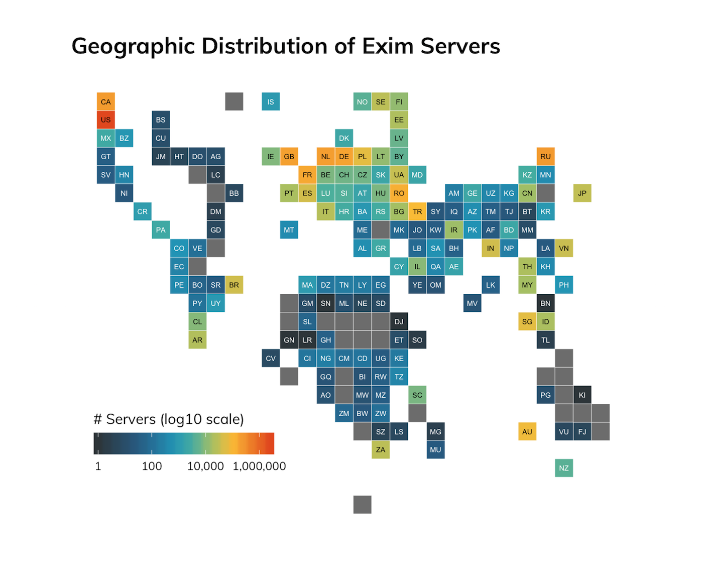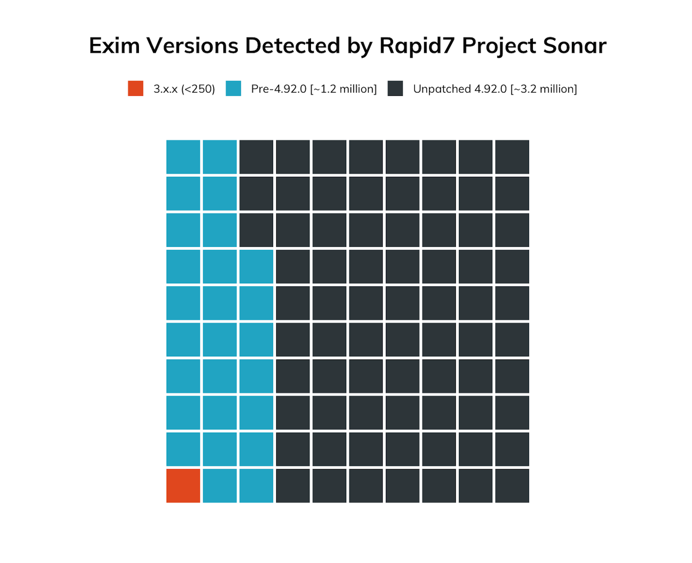 The Rapid7 Labs team regularly scans for internet mailers via Project Sonar and found over 5 million live Exim servers, of which over 4.5 million had detectable, valid version numbers.