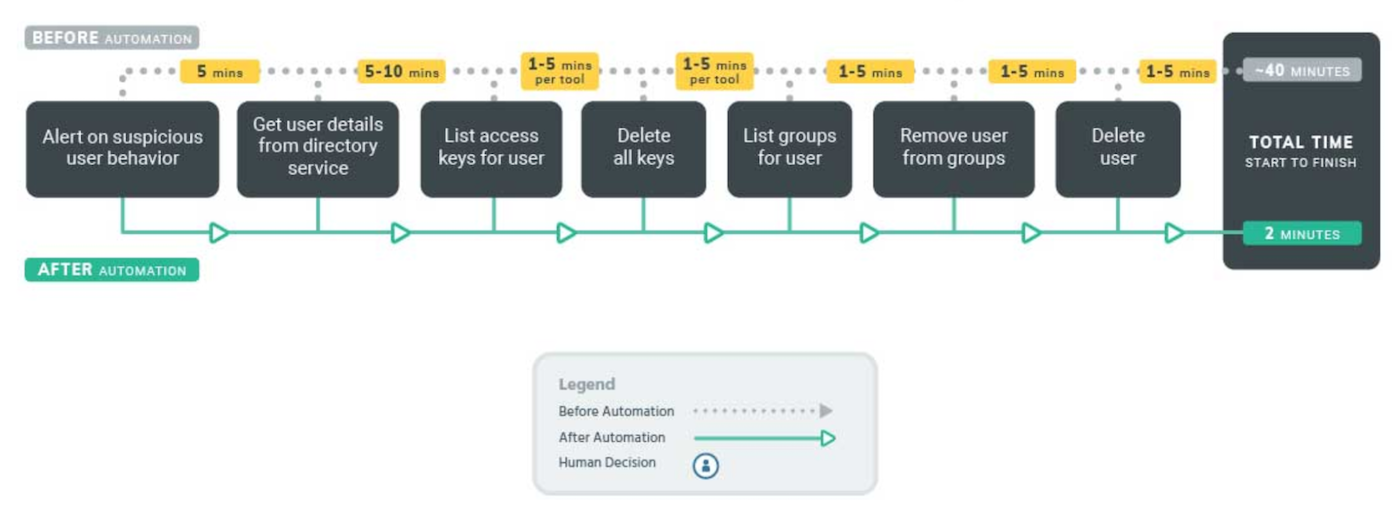 When an incident occurs, SOAR processes can immediately and automatically deprovision exploited user accounts, remove user access from key systems (such as AWS), and revoke permissions as needed until the threat is contained. This single process ensures that damage can’t be done to major infrastructure.