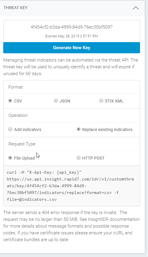 $Url = "https://us.api.insight.rapid7.com/idr/v1/customthreats/key/" + $ThreatKey + "/indicators/replace?format=csv"
