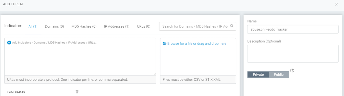 Start by creating a private threat in InsightIDR, which you will find under Settings -> Alert Settings -> Community Threats. Select Add Threat, and fill out the fields for your threat feed. You must have at least one indicator in order to save the threat, so I have entered in a harmless IP address in as threat. This IP address will be removed from the threat later on automatically with our script, so it is not important what you use for this first indicator.