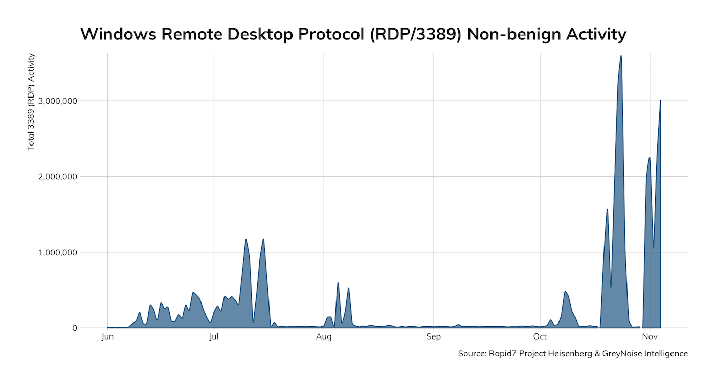 A critical vulnerability called “BlueKeep” put Remote Desktop Protocol (RDP) security on everyone’s radar earlier this year. Just a few months later, Microsoft announced a related vulnerability, DejaBlue. RDP exploits are no joke—Rapid7’s Project Sonar estimates that around 900,000 workstations and servers running RDP around the world are vulnerable. And, since Nov. 1, Rapid7’s Project Heisenberg caught 12,949 unique IPv4s, with endpoints in the Netherlands, Italy, and France accounting for nearly 70% of the unique sources.