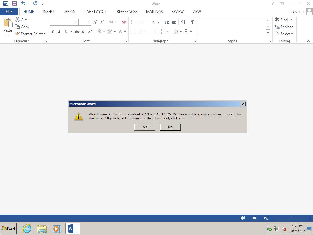 After clicking "OK," a new error dialog box displays the following: "Word found unreadable content in 18575DOC18575. Do you want to recover the contents of this document? If you trust the source of this document, click Yes."