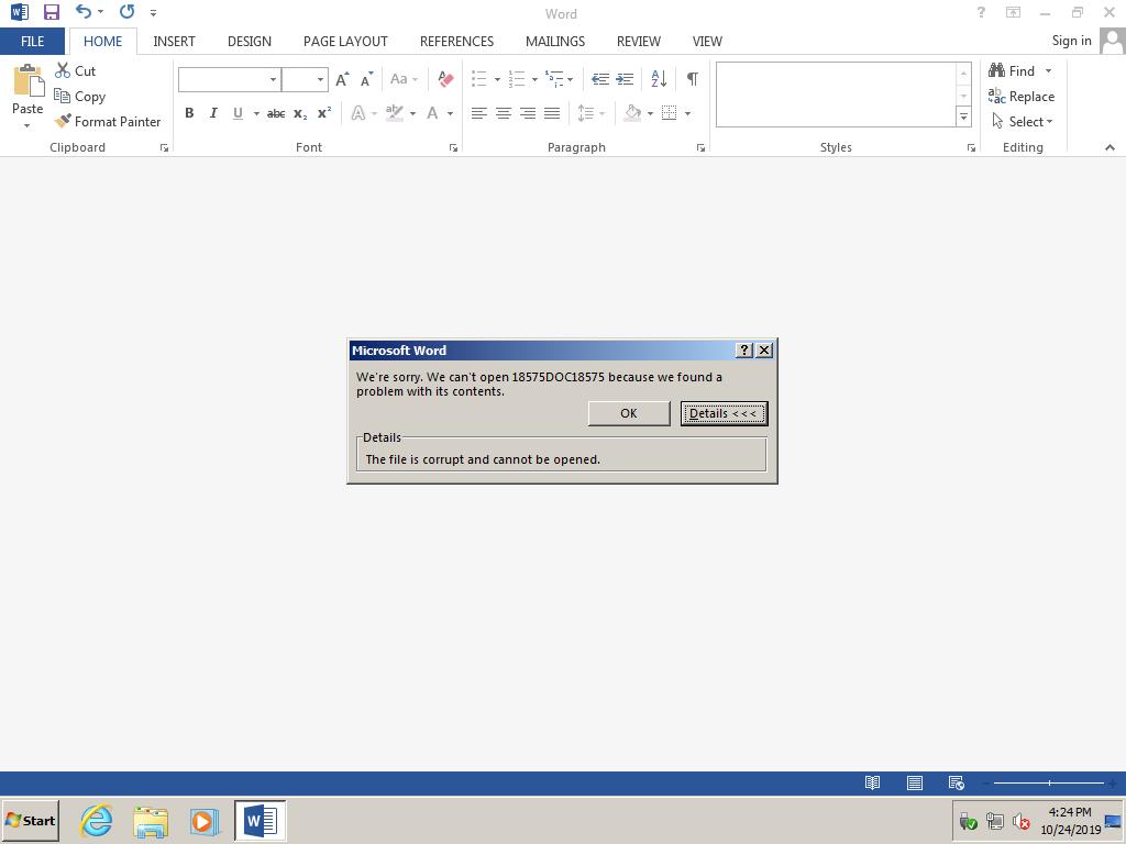 Clicking “Details” reveals the following message: "The file is corrupt and cannot be opened."