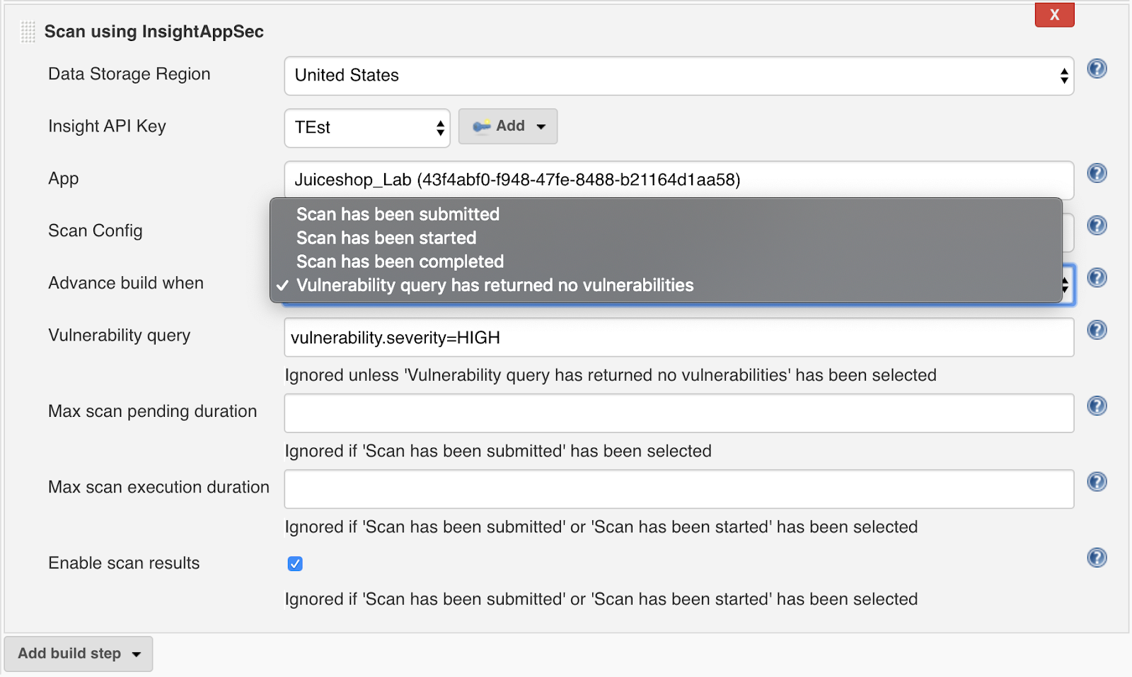 The InsightAppSec API key allows Jenkins to connect and launch a scan, check on the scan status, and more. It’s as simple as adding a build step using InsightAppSec and then selecting an application to be scanned. Depending on your organizational structure and how collaborative your security and DevOps teams are, scan queries can be decided as a team or individually.