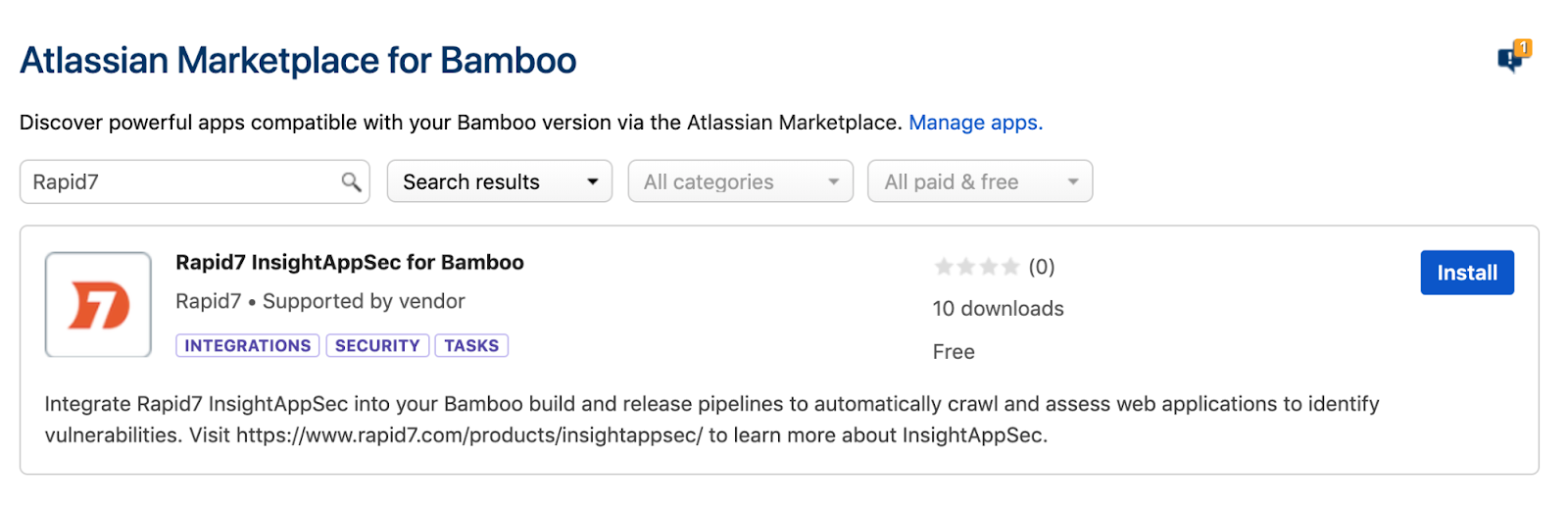 The Rapid7 InsightAppSec Bamboo plugin is currently available on the Atlassian Marketplace for free and can be downloaded for installation and usage within Atlassian Bamboo. The plugin itself is also fully open source, and the project is available on GitHub for those who would like to make contributions. They are always appreciated!
