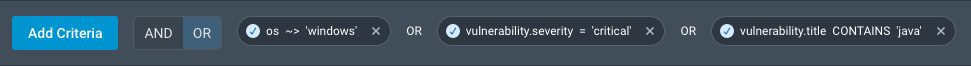 The Query Builder is a cloud-based feature that helps you distill asset and vulnerability data using custom-built queries in InsightVM. These queries are composed of “pills,” which are individual criteria that filter your data based on an array of unique parameters. These pills display and define the fields, operators, and values as the query is built.