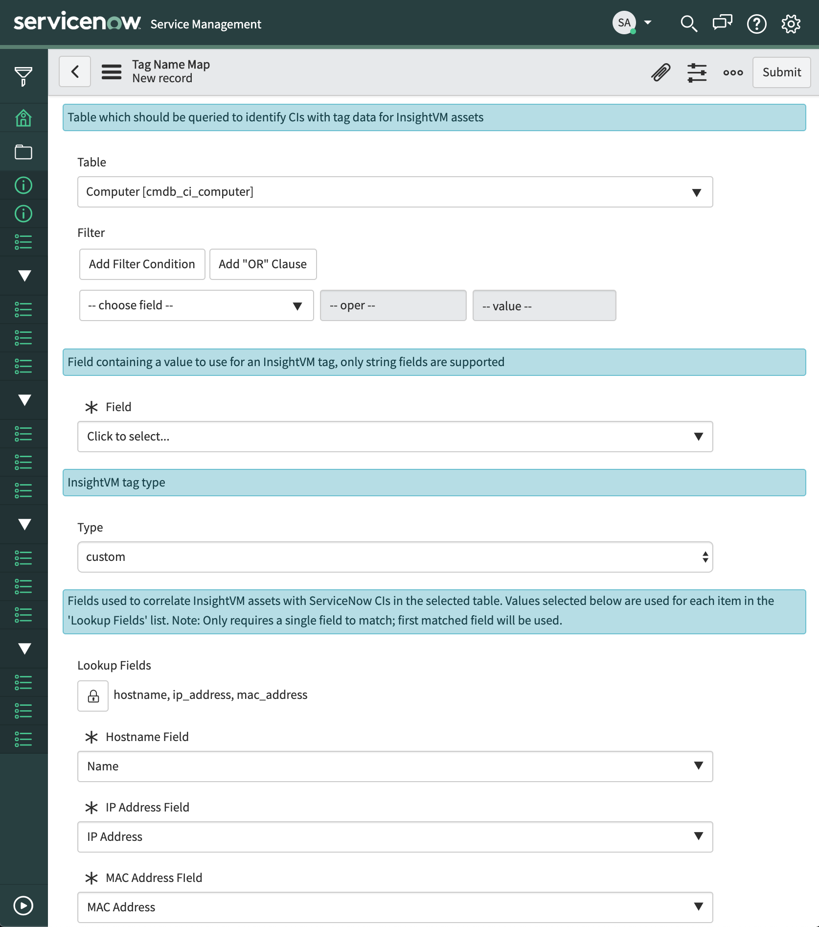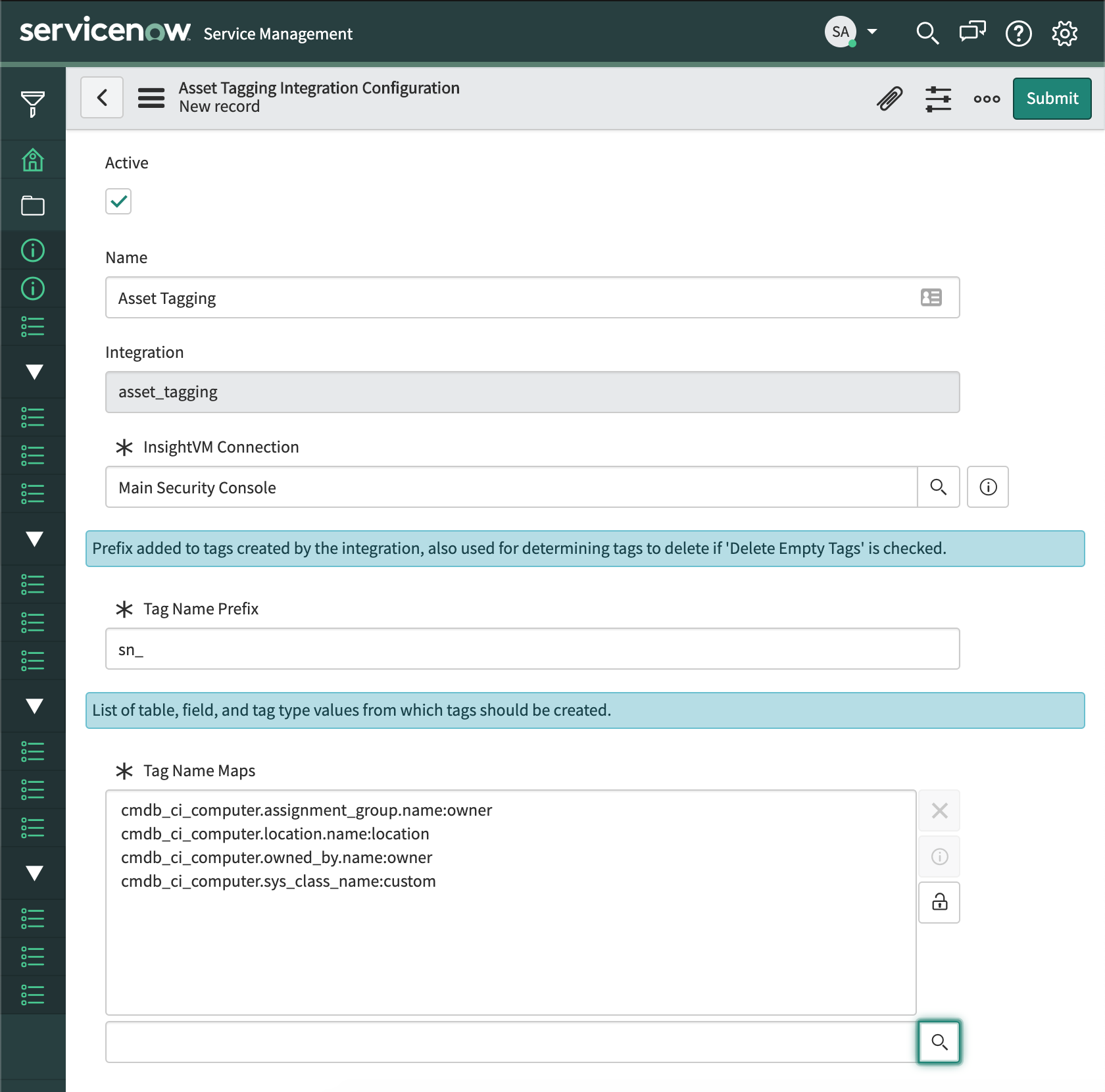 Tag Name Maps provide the capability to define configuration for tags which should be created. This includes the table and field from which ServiceNow CI data will be gathered to determine the tag names to be created/updated, as well as the assets to which the tags should be associated. In addition, the fields which should be used to correlate InsightVM assets with ServiceNow CIs can be configured.