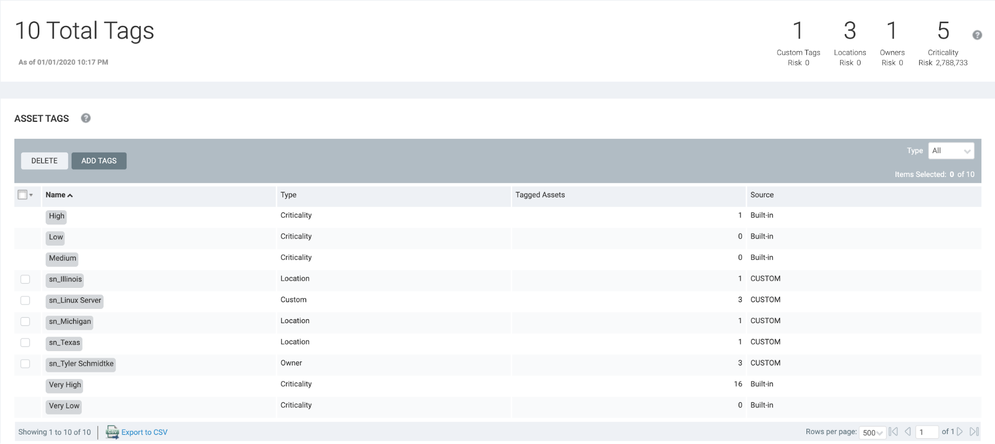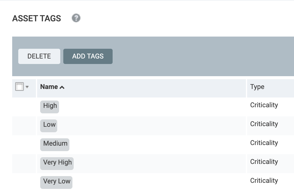 Prior to running the integration, all other tags were deleted from the console so that only the built-in criticality tags existed: