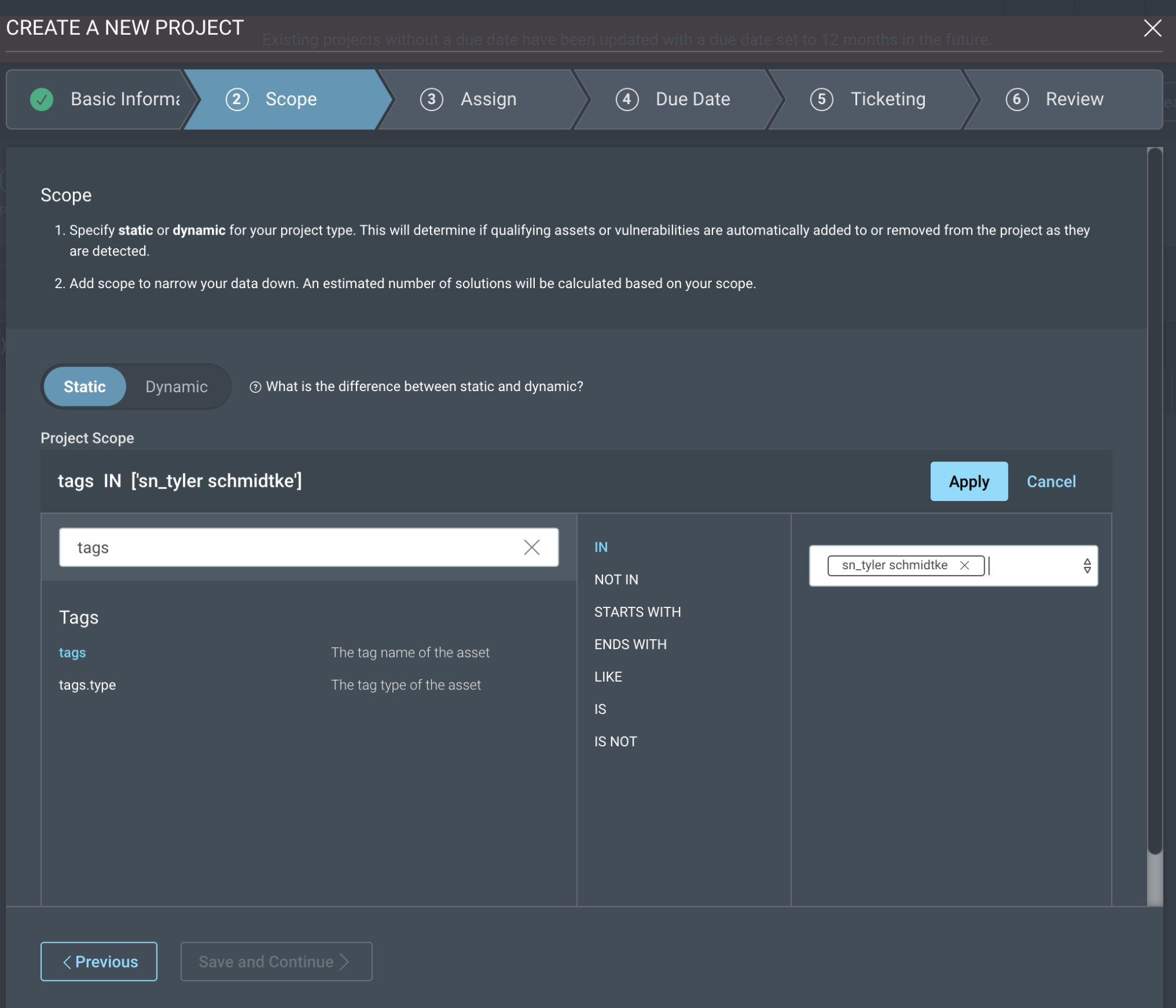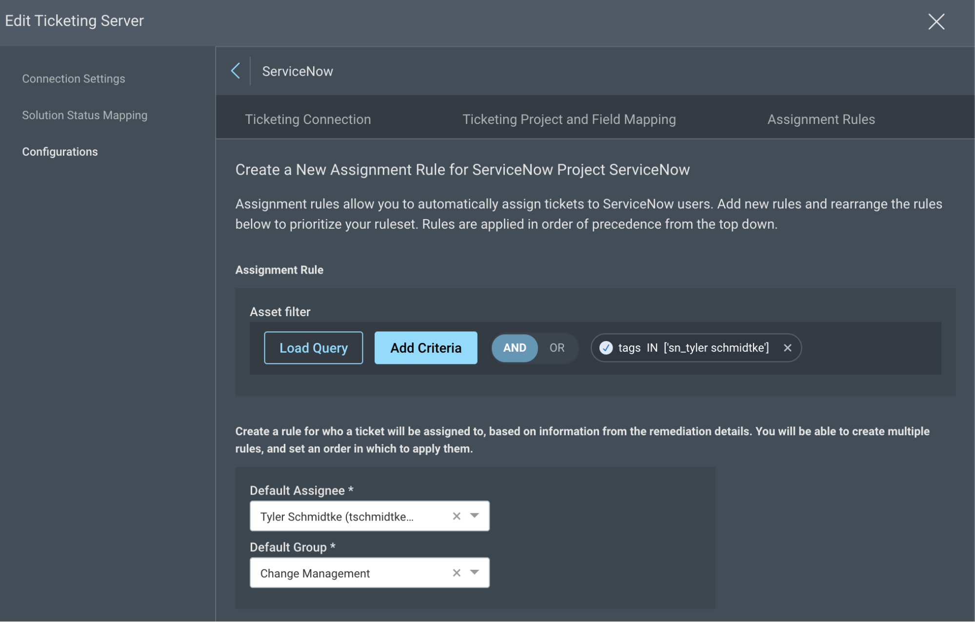 Additionally, if there is a ServiceNow Ticketing connection configured (documentation), the project can be configured to generate ServiceNow incidents based on this tag; and we can ensure that the incident is assigned to the proper owner by scoping it with the new owner tag: