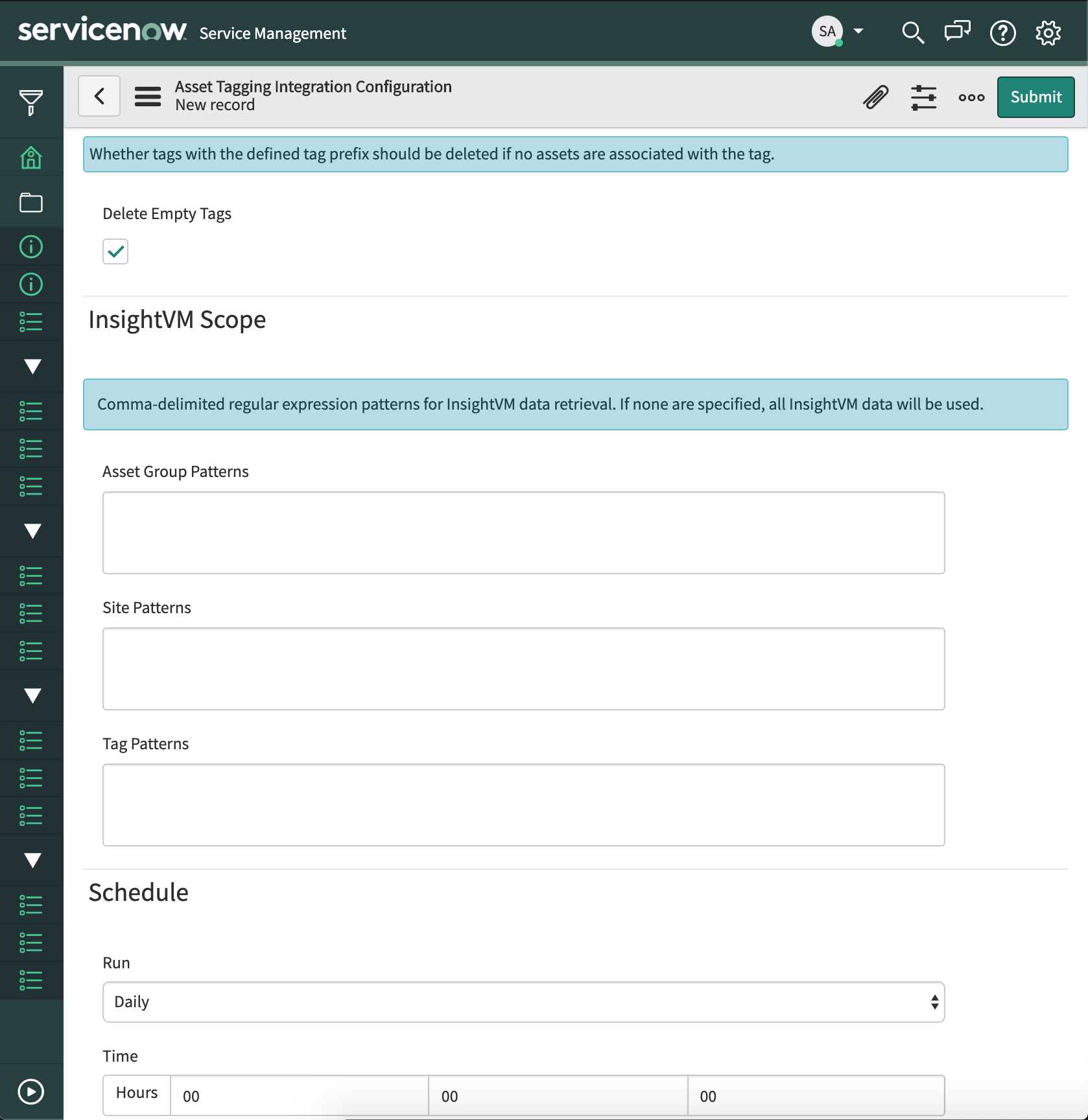 From the Rapid7 InsightVM Integration for CMDB menu in ServiceNow, you'll find three submodules specific to the InsightVM Asset Tagging integration: