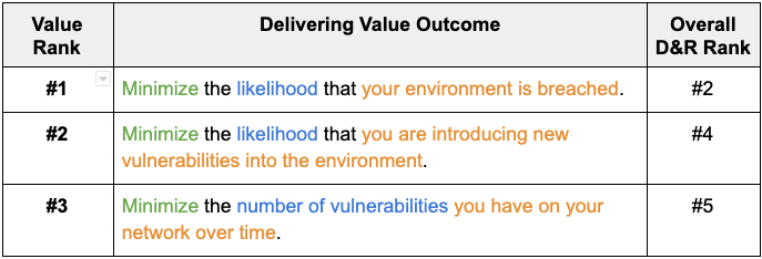 The first thing to note was that value was the No. 1 outcome for D&R programs but fell to No. 2 for ASM, where efficiency (measured by the reduction trend over time) earned the top spot. We might be reading too much into this, but if value is not the No. 1 goal of any aspect of your security program, it either needs to be eliminated or priorities need to be rearranged.
