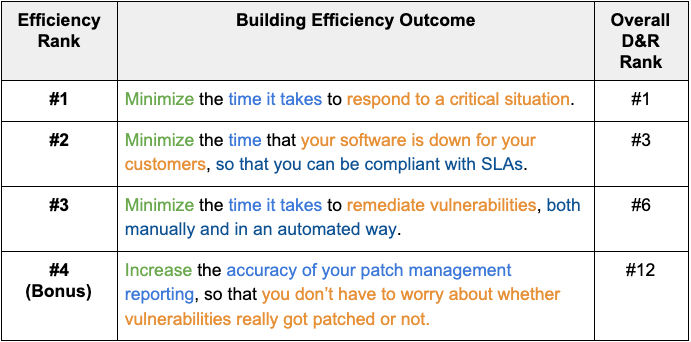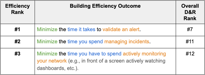 Second, the outcome tied to efficiency in almost all cases is directly linked to value. ASM 1 and 6 and D&R 7, 11, and 12 aim to improve the speed with which we can deliver value back to the organization. This really goes to validate that the respondents are focused on squeezing efficiency out of the outcomes they feel deliver value to their organizations.