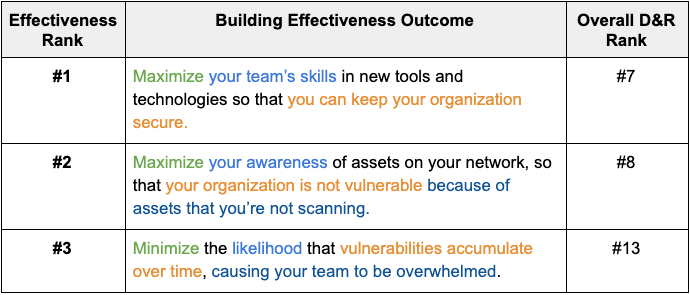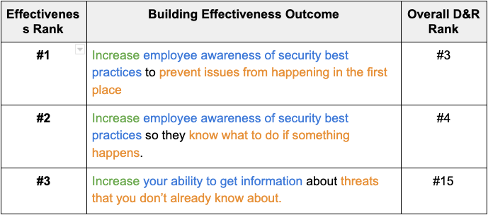 The last takeaway for the “effectiveness” top three is that issues of visibility and issues of threat awareness only appear once. We already established that we require knowledge and capability to create effectiveness, but visibility and threat awareness create knowledge. You can’t find what you can’t see, and you can’t identify what you don’t know.
