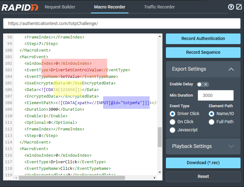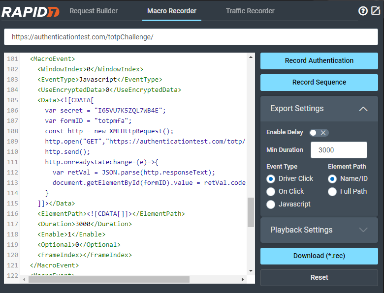 We want to go to Authentication Test’s TOTP Challenge, collect our secret key, and build a macro that allows automatic population of the username, password, and the MFA code to allow us to log in.