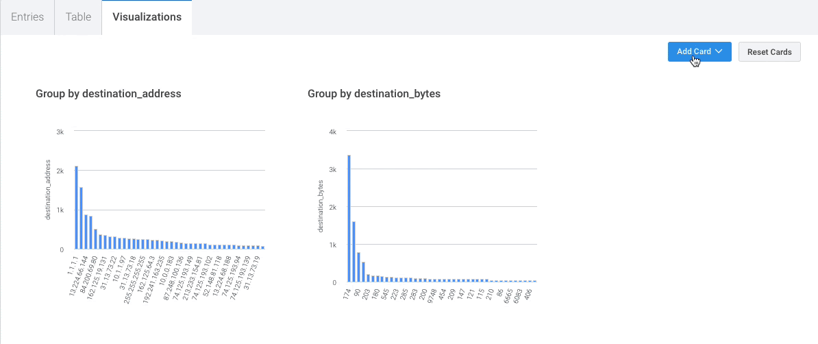 Where users could already see and format search result entries in raw form and in a table, they can now access a visualizations tab to see search results in a graphical snapshot.