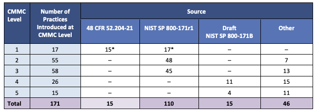 There are a total of 171 practices mapped across the five levels of CMMC maturity.