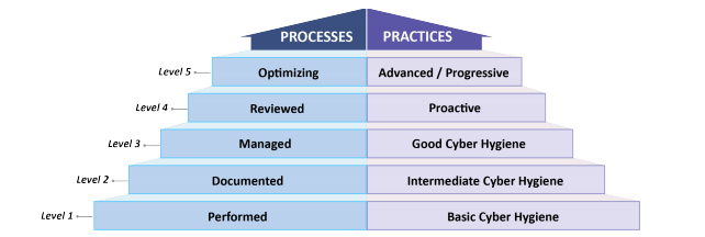 The CMMC model measures cybersecurity maturity across five levels. Each level consists of a set of processes and practices within a domain. Practices further define capabilities (to be expanded upon in Part 2 of this blog series).