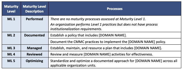 It’s important to understand that the set of processes and practices is cumulative, meaning that in order to achieve compliance with a specific maturity level, an organization must be compliant with all preceding maturity levels as well. Additionally, it is not enough to have practices implemented. Maturity of process is also required, and this is evaluated by the extent to which the practices are ingrained within the culture of your organization, which the CMMC refers to as institutionalization. If your organization demonstrates Level 3 maturity within a practice, but only a Level 2 maturity within the process, the compliance is certified at the lower of the two maturity levels.