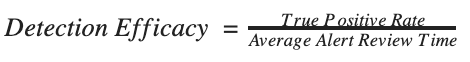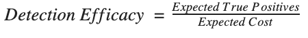 We seek to derive a useful, universal metric to evaluate detection signatures. For this article, we will call this metric “Detection Efficacy.” We assume that every alert has both an expected benefit (finding evil) and an expected cost (the time and resources it takes to review). The worth of the signature should therefore weigh the costs versus the benefits. We’ll start by calculating the expected benefit.