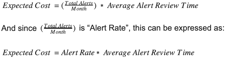 Calculating the cost is straightforward—the total number of analyst-hours the signature generates. This is calculated by multiplying the total number of expected alerts, times the average review time per alert. If it takes 15 minutes on average to review an alert and make a decision, then the time cost of this service over a month is: