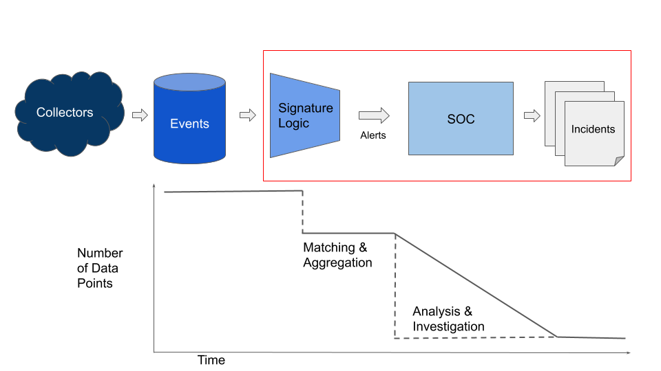 Below in Figure 1 we show a simplified version of this process, as events become alerts, and alerts become incidents. The steps we will discuss are noted by the red box - the efficacy of the exchange between the signature logic and the SOC.