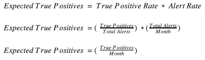 If I bet $50 on a horse with a 20% chance of winning a race, the expected value of the bet is $50 times 20% = $10. Applying this logic to security looks like the following: If a detection signature has a historical 30% true positive rate and produces an average of 400 alerts per month, the expected number of true positive alerts for the next month is 400 times 30% = 120 true positive alerts. Therefore, expected average true positives for a signature is equal to: