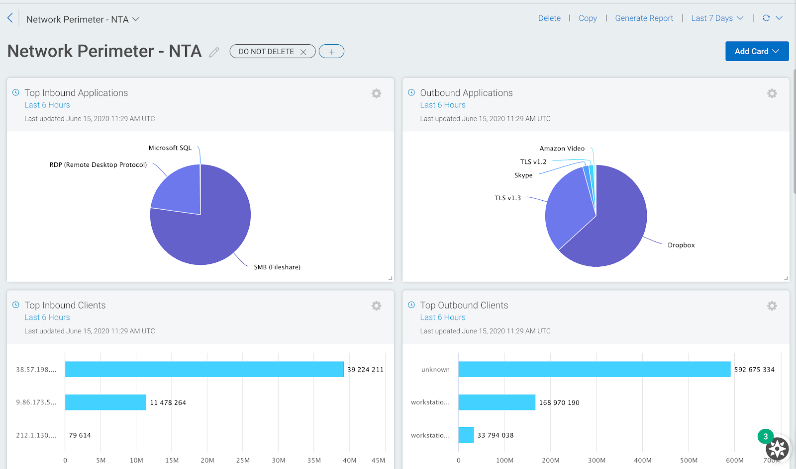One thing that’s been especially exciting for our Product team since the launch of Network Traffic Analysis is to see how customers have been using this data for their own reporting and monitoring use cases. Many customers are building custom InsightIDR dashboards to improve real-time monitoring of network activity within their networks and at the edge. The image below shows a popular one that focuses on the network perimeter. This can be easily set up by going to the dashboard card library and selecting relevant reports from the network data sections. Other popular dashboards would be those that focus on WFH activity and dashboards which focus on east-west or internal network activity.