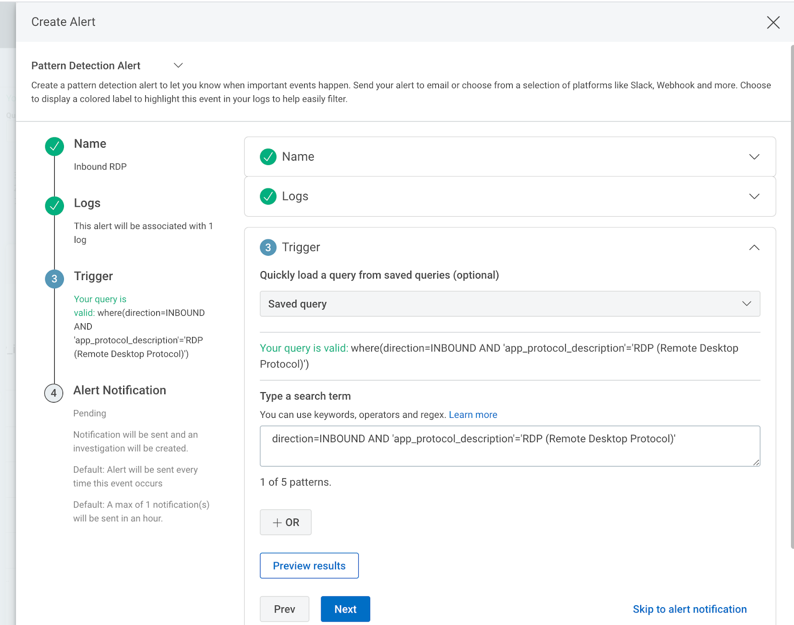 InsightIDR includes a comprehensive library of Attacker Behavior Analytics. These are used by customers and our MDR team to detect and investigate suspicious activity on networks. Customers can also create their own custom alerts, and using network flow data as a source is a popular use case for the Insight Network Sensor. The image below shows an example custom alert where we focus on any inbound RDP activity into the network.