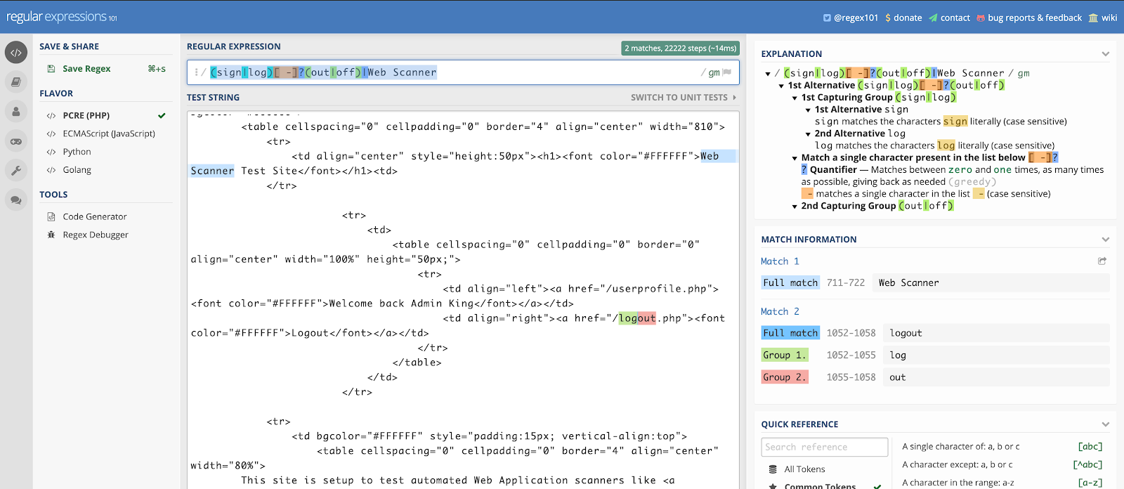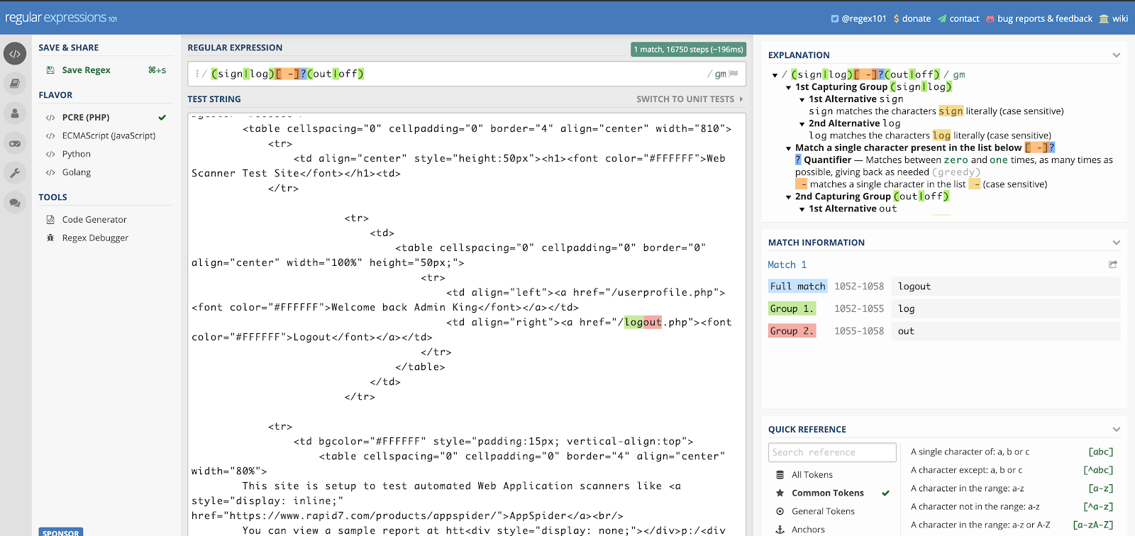 The default regex is copied in the Regular Expression section. In the Test String, copy the HTML response of the logged-in application page. As you can see on the right, we have a full match to the word logout, thus indicating that our default regex will in fact work as long as our recorded macro gets us to the specific logged in page.