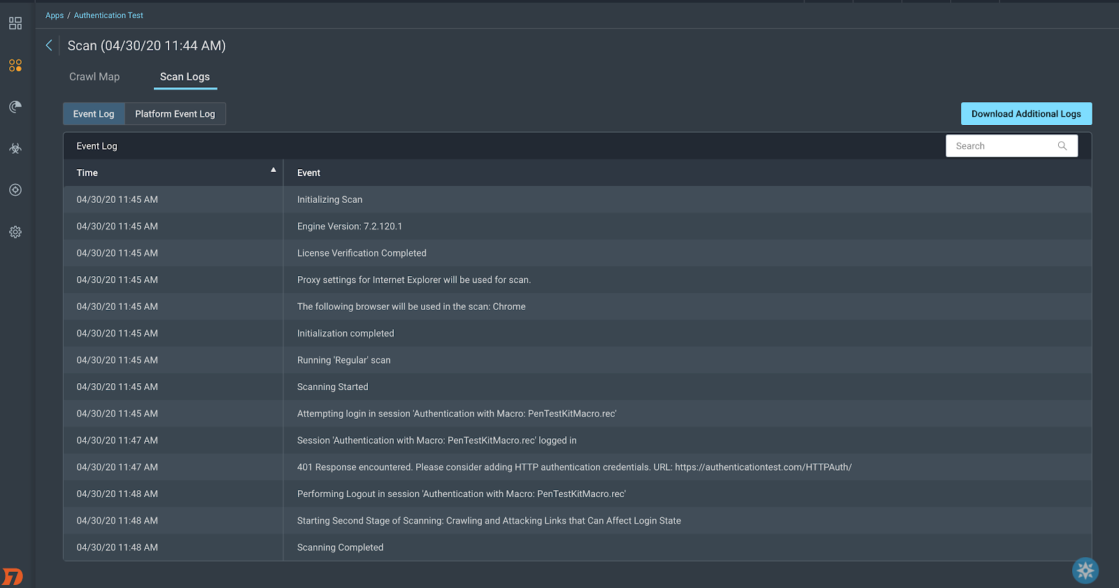 Once the above steps have been verified, now we can jump to the Event Logs view of our scan. Below are the screenshots to show where you can find the information we need: