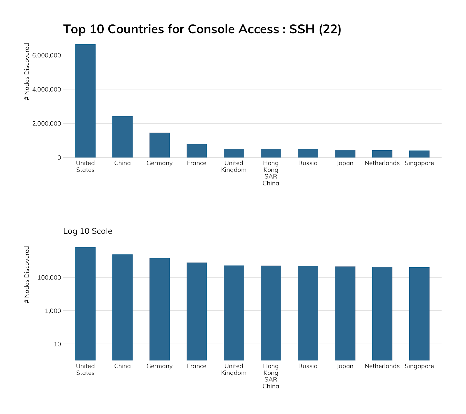 One of the bright spots of this report analysis is the fact that SSH deployment has now outpaced Telnet exposure at a rate of six to one—it seems the world has gotten the message that, while direct console access from the internet might not be the wisest move in the world, about 85% of those exposed shells are secure shells, which takes whole classes of eavesdropping, spoofing, and in-transit data manipulation attacks off the table. Good job, internet, and especially the American network operators around the country—the United States exposes a ratio of 28:1 SSH servers (6.6 million) than Telnet servers (a mere 232,000). Compare this to the 3:1 ratio in China, which is 2.4 million SSH to 734,161. Given that SSH provides both console access and the capability of securing other protocols, whereas Telnet is used almost exclusively for console access, that United States ratio is pretty outstanding.