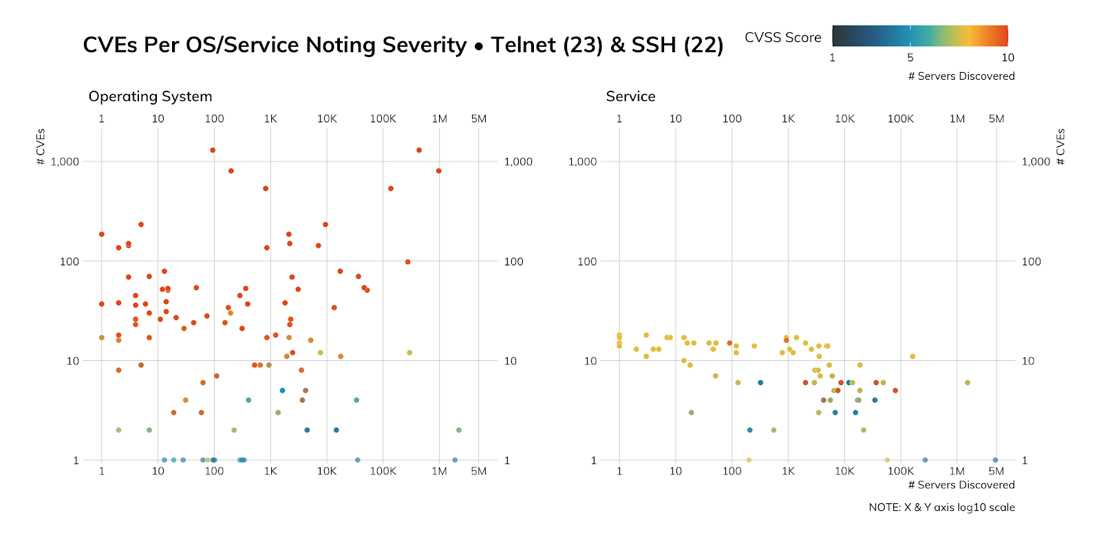 The right panel is the same, just for SSH versions (one of which we enumerated above). The count difference is due to both recog coverage and the fact that a single operating system version can run different versions of SSH, so the aggregation up to operating system category will be higher. There are fewer major vulnerabilities within the SSH services but there are more above 7 than below, which means they’re also pretty high-priority.