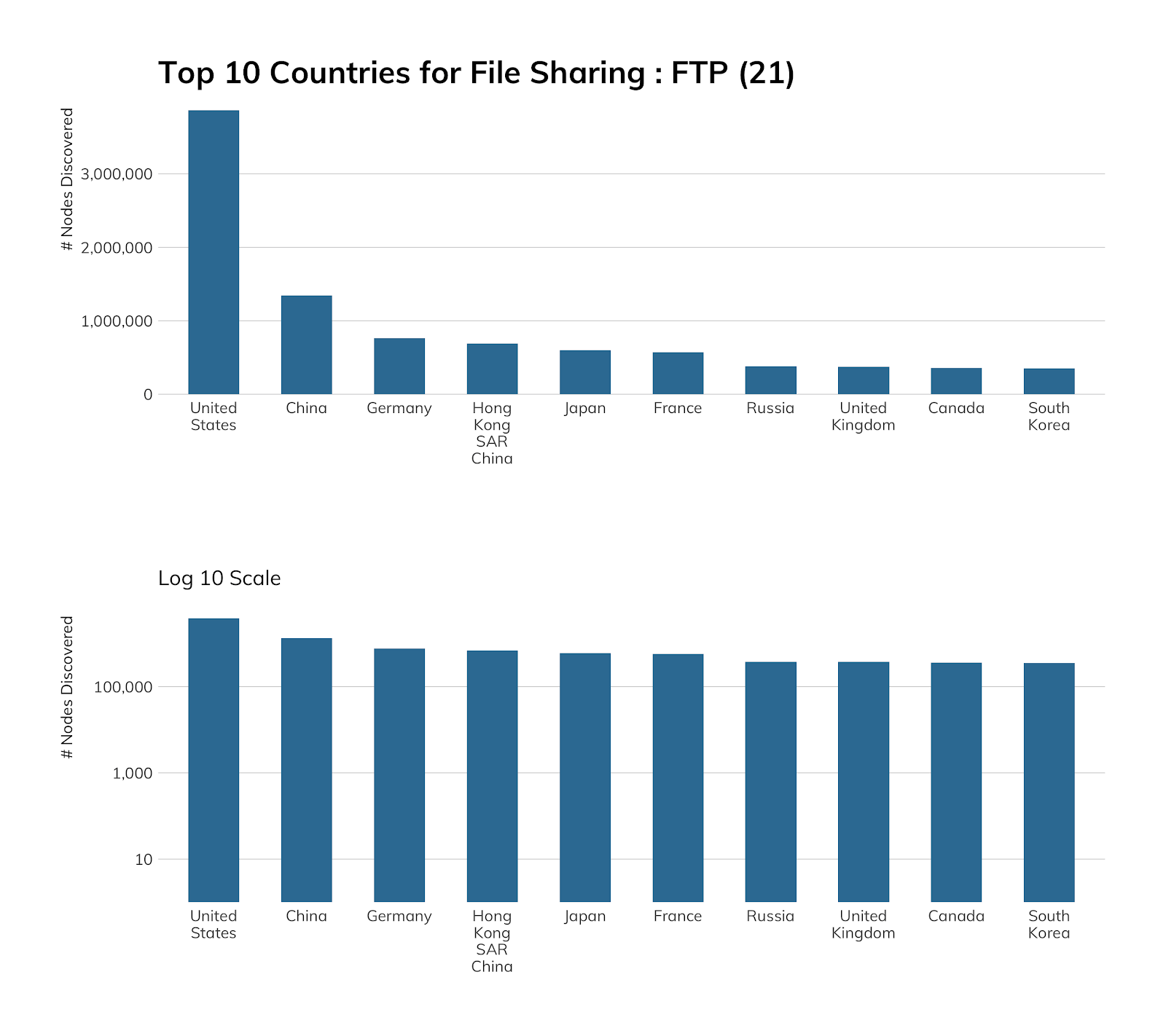 Project Sonar found just under 13 million active FTP sites (12,991,544), which is down from over 20 million from our previous National Exposure Index study. The United States leads the pack when it comes to exposing FTP to the internet with ~3.9 million hosts awaiting your OPEN.