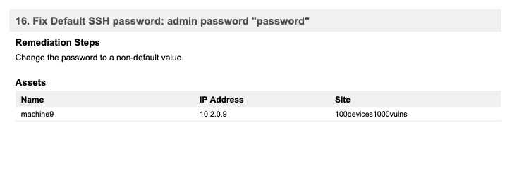 By combining the ‘Devices Authenticated with Default Creds’ DAG with the filter in a report (I recommend the ‘Top 25 Remediation with Details’ report), we can now get a report that shows only assets with default account vulnerabilities and only shows default account vulnerability solutions. This report will allow you to see exactly which ‘default account’ vulnerability there is on each asset and the solution on fixing the vulnerability.