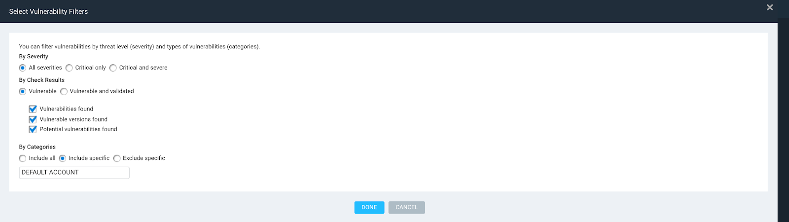 Set Vulnerability Filter to Include Specific Category ‘Default Account’: